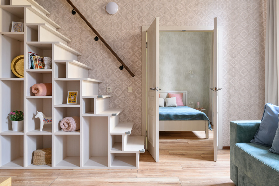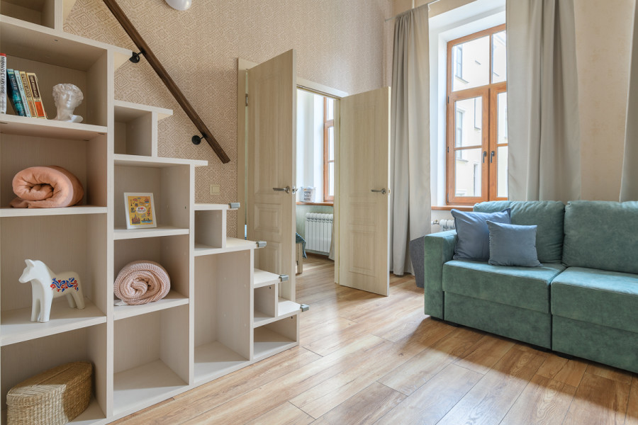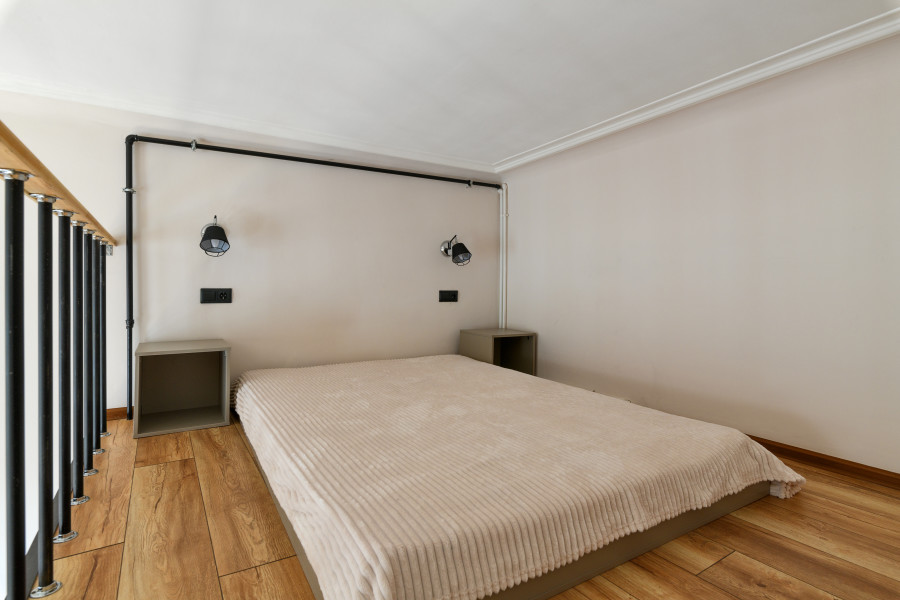 - Мебель: вешалка, диван раскладной, зеркало, матрас, прикроватные тумбочки, стол, стулья, шкаф